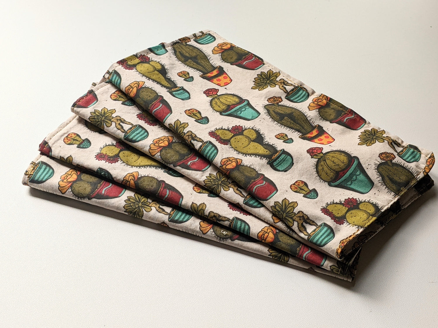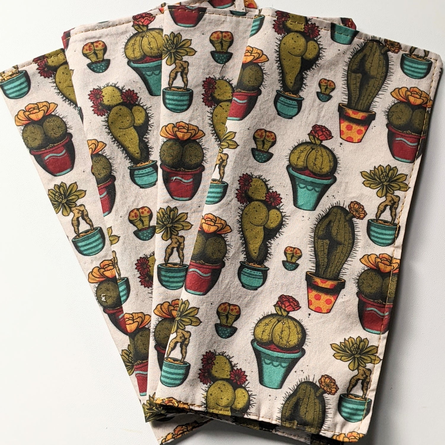Spice up your meals with these cheeky cloth napkins! Each pack comes with four 9x9 double sided cloth napkins. Use them for everyday at home meals, a picnic outing, lunch boxes, or spare napkins in your car!