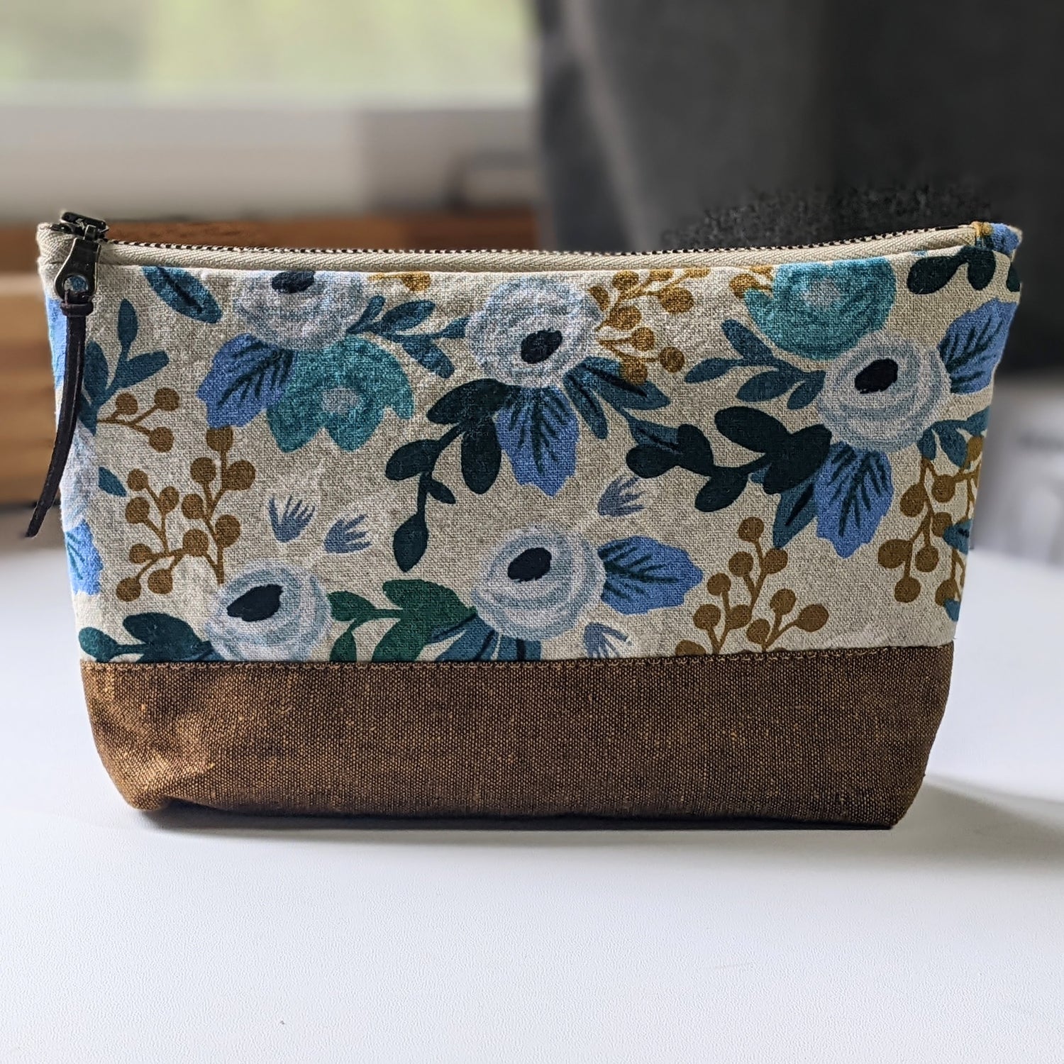 This adorable pouch is the perfect size for a purse or travel bag! Lined with complimentary fabric and equipped with an antique brass YKK zipper, and Rifle Paper Co. fabric.