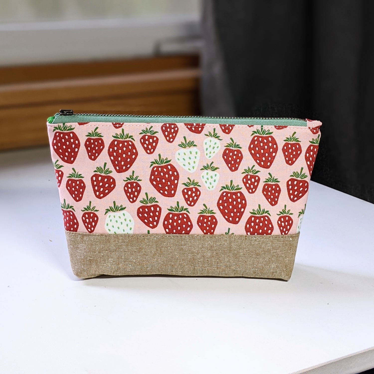 This adorable pouch is the perfect size for a purse or travel bag! Lined with complimentary fabric and equipped with an antique brass YKK zipper, and Cotton+Steel fabric.