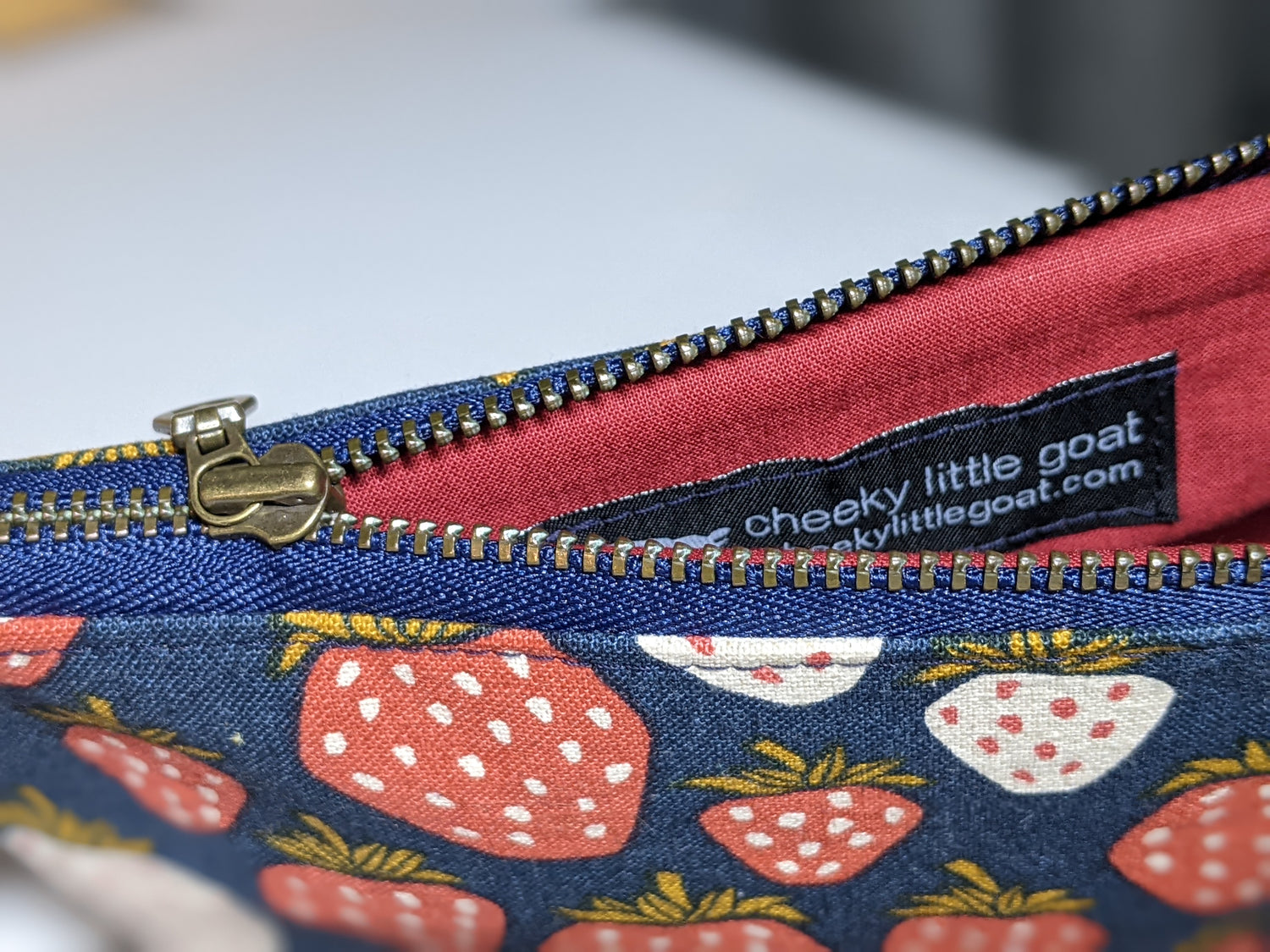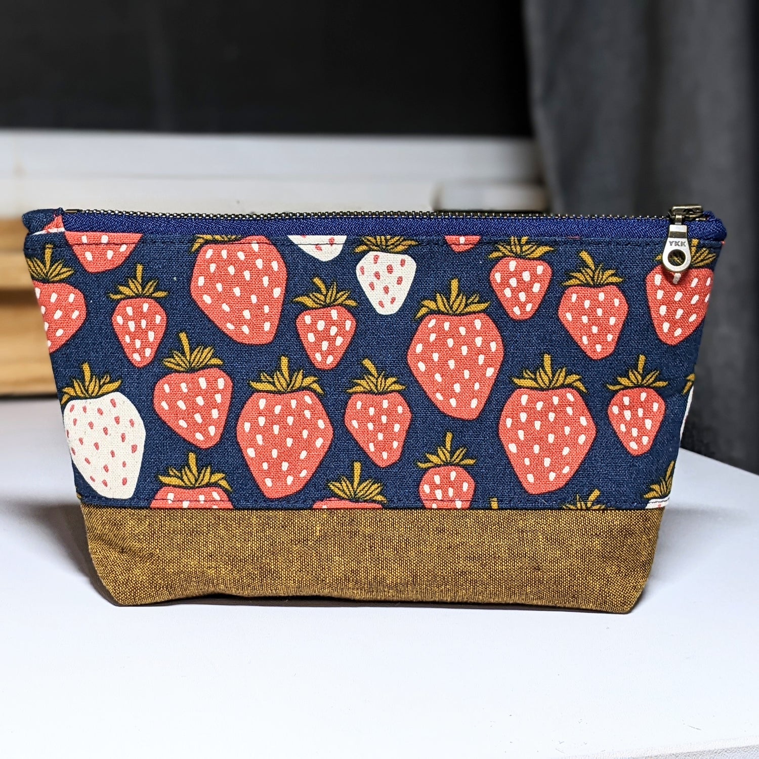 This adorable pouch is the perfect size for a purse or travel bag! Lined with complementary fabric, equipped with an antique brass YKK zipper, and featuring Cotton + Steel fabric.