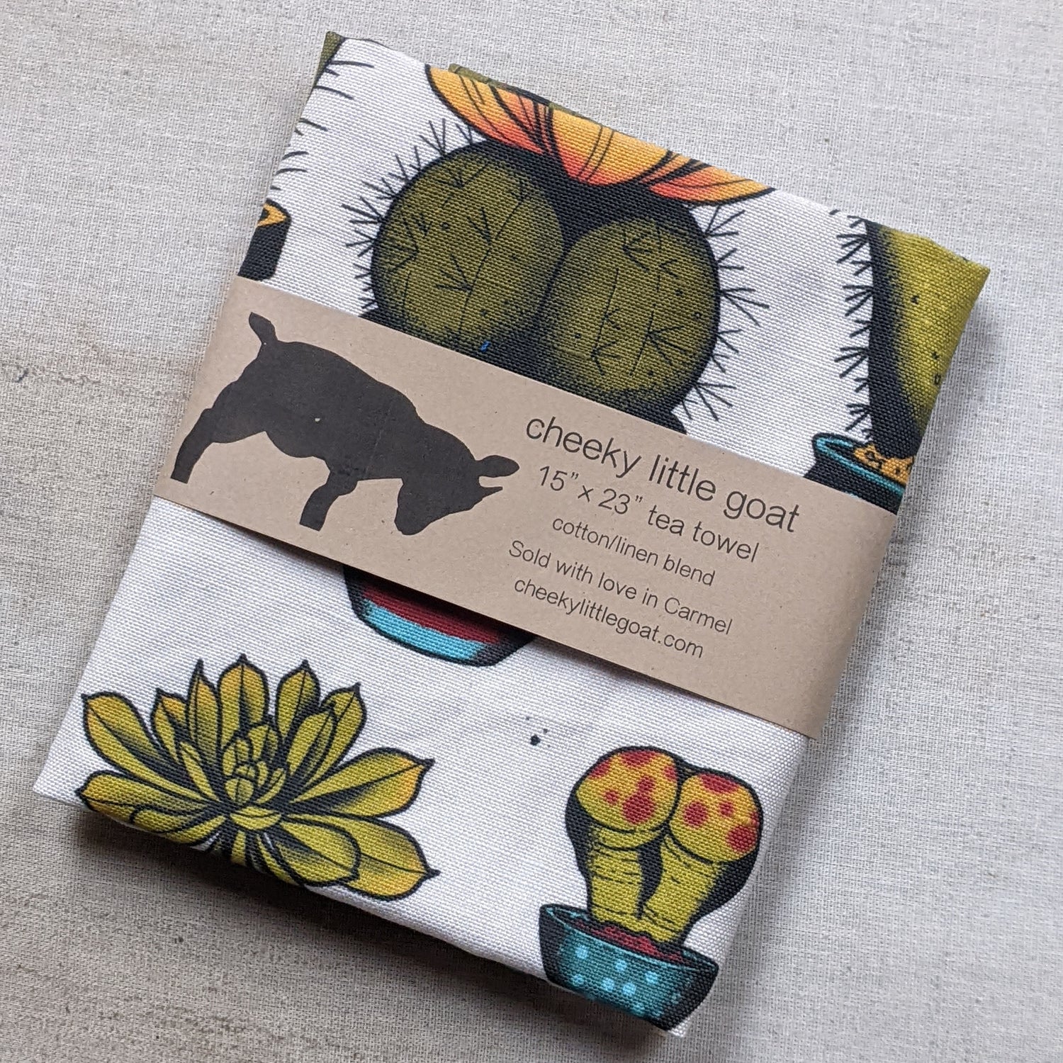 Time to spice up your kitchen with this cactus bootie tea towel! Made of a linen cotton canvas blend, it will soak up spills while giving you that fun in the kitchen vibe.
