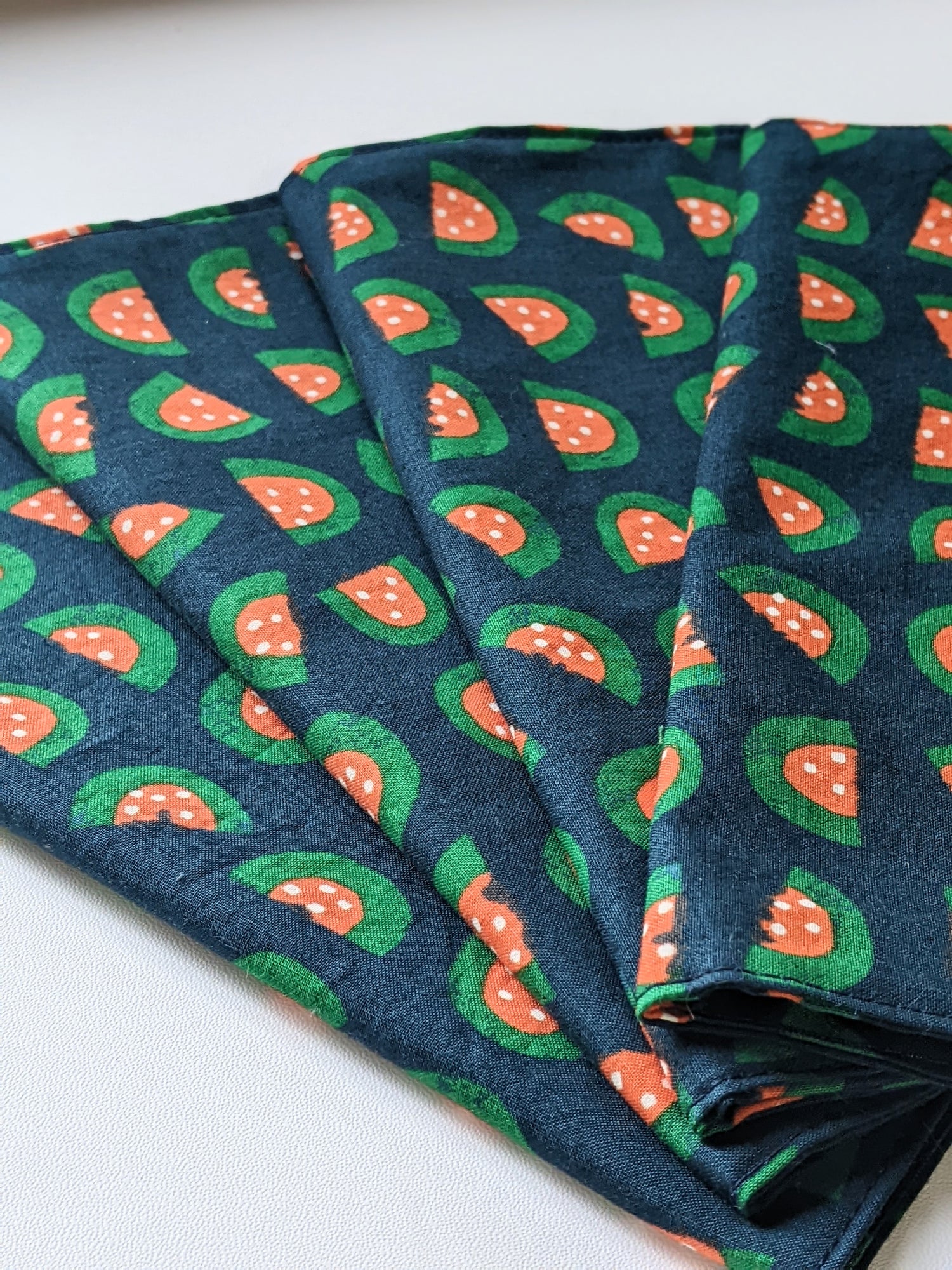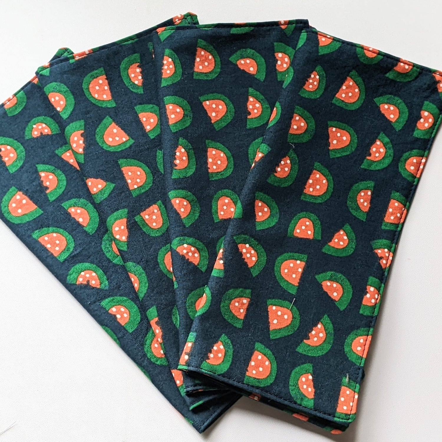 Brighten up your meals with these adorable watermelon napkins! Each pack comes with four 9x9 double sided cloth napkins. Use them for everyday at home meals, a picnic outing, lunch boxes, or spare napkins in your car!